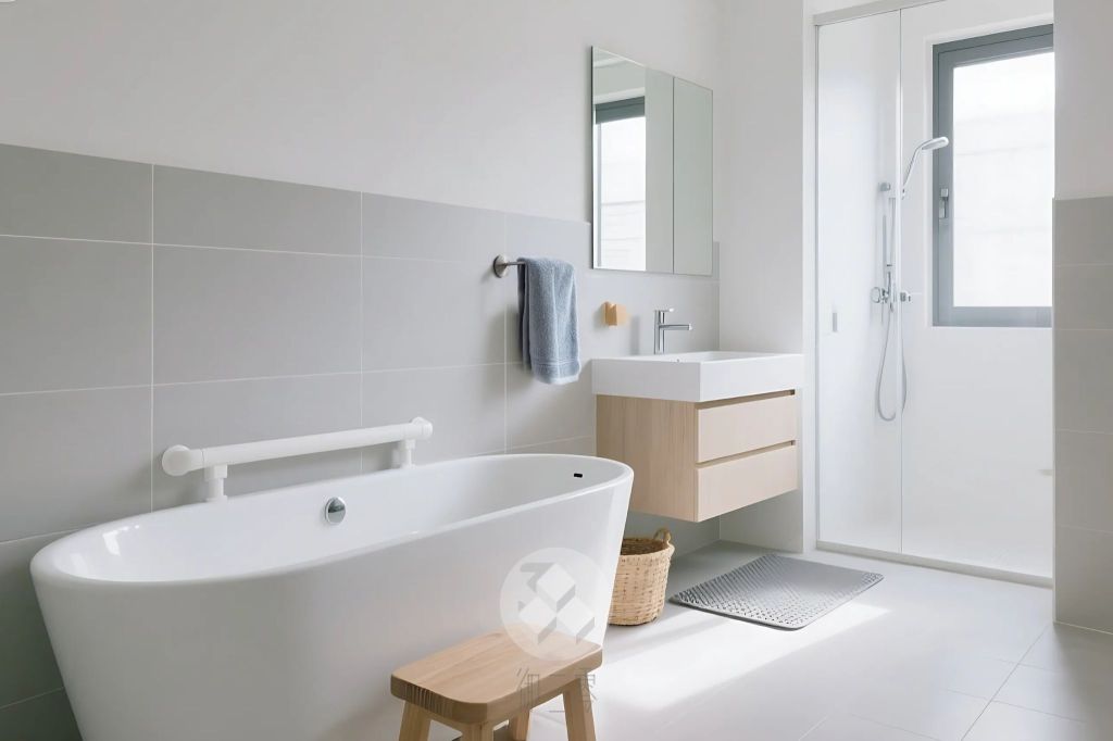 浴室是家中濕滑容易發生意外的地方。建議選用防滑地磚,尤其是具備奈米技術的磁磚,即使有水也能提供良好防滑效果。若有浴缸,可在乾濕分離區和浴缸之間設置矮凳作為緩衝踏階,並加裝安全扶手,特別是對於有長輩的家庭,可大幅降低進出浴缸時滑倒的風險。此外,在浴室安裝暖風機,可維持空間溫度,避免小孩或長輩在洗澡前後著涼。